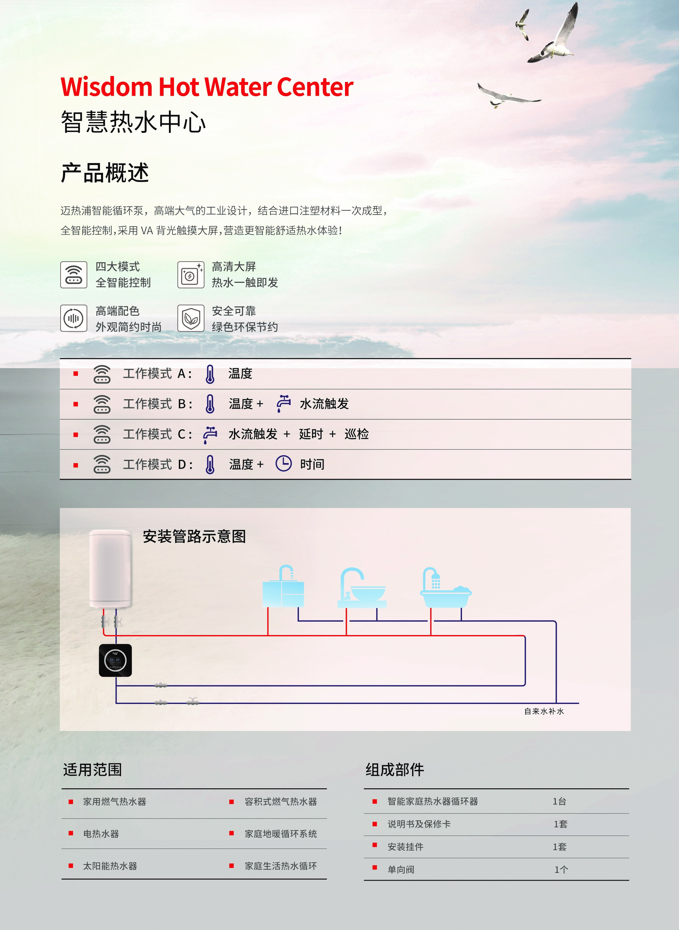 邁熱浦智能循環(huán)泵,高端大氣的工業(yè)設計,結合進口注塑材料一次成型,全智能控制,采用VA背光觸摸大屏,營造更智能舒適熱水體驗!