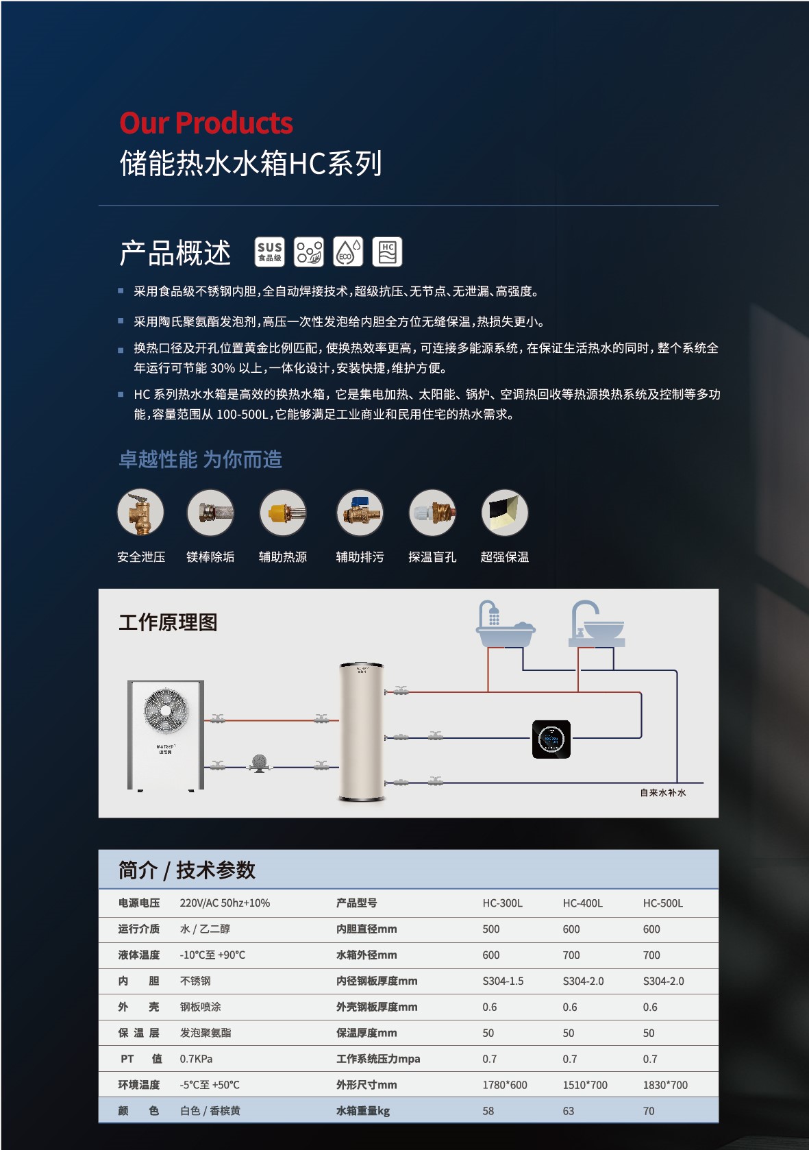 ● HC 系列熱水水箱是高效的換熱水箱,它是集電加熱、太陽能、鍋爐、空調(diào)熱回收等熱源換熱系統(tǒng)及控制等多功能容量范圍從 100-500L,它能夠滿足工業(yè)商業(yè)和民用住宅的熱水需求。