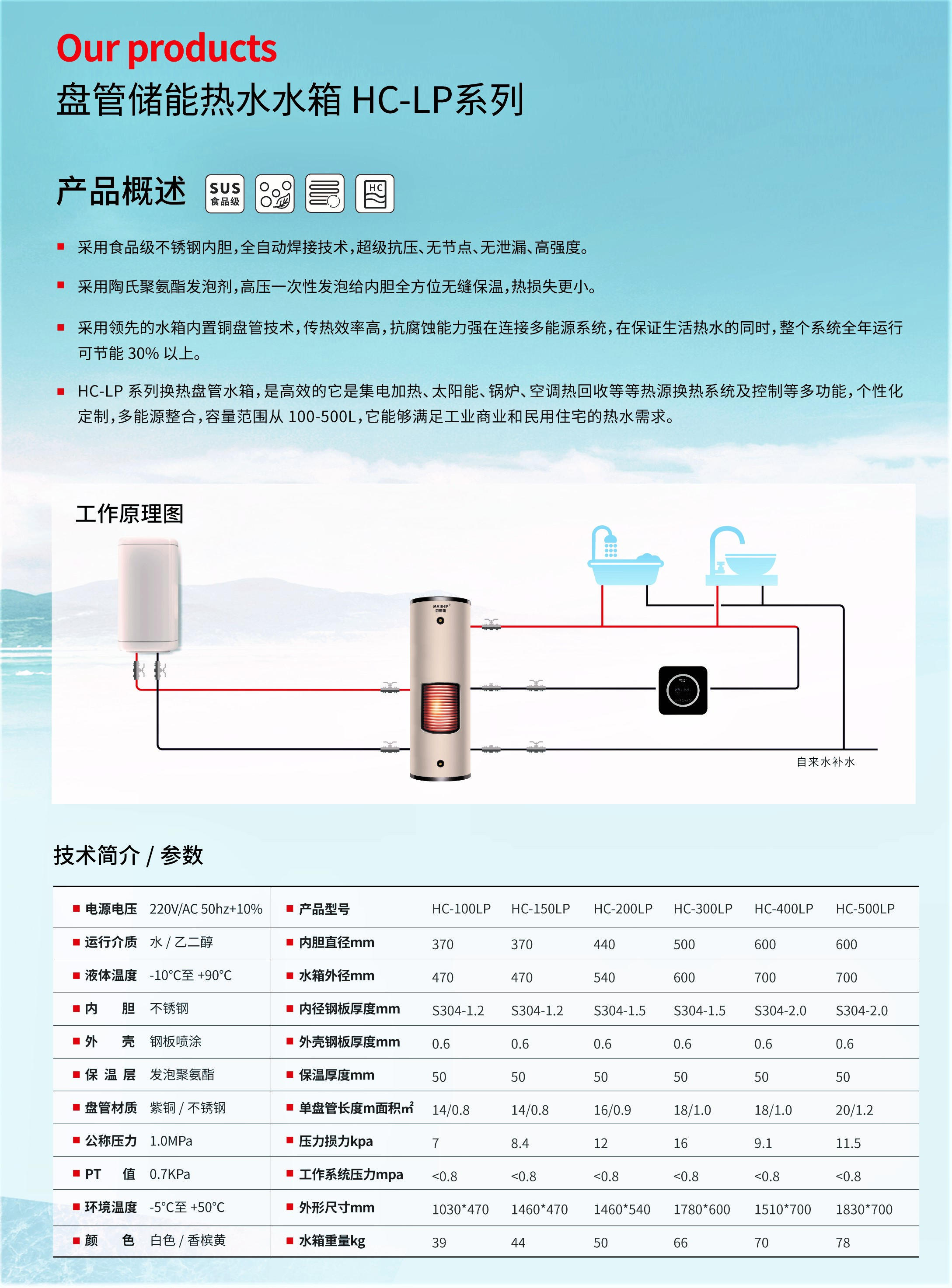 ● HC-LP 系列換熱盤管水箱,是高效的它是集電加熱、太陽能、鍋爐、空調(diào)熱回收等等熱源換熱系統(tǒng)及控制等多功能,個性化定制,多能源整合,容量范圍從 100-500L,它能夠滿足工業(yè)商業(yè)和民用住宅的熱水需求。
